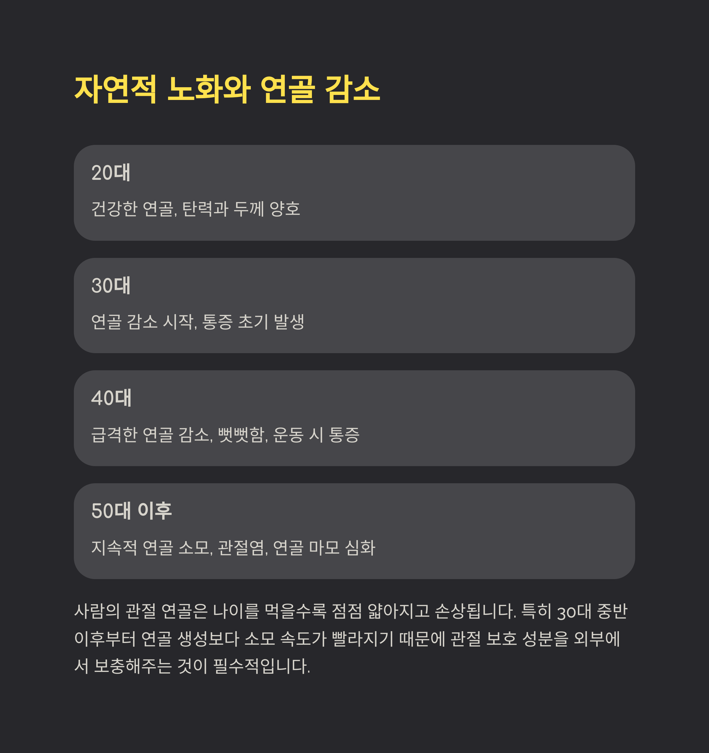 50대 이후 | 지속적 소모 | 관절염, 연골 마모 심화 |