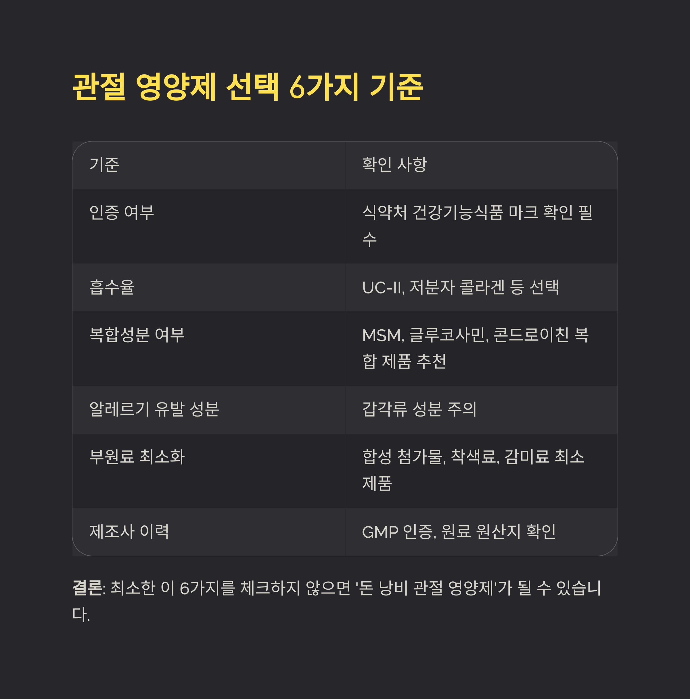 결론: 최소한 이 6가지를 체크하지 않으면 '돈 낭비 관절 영양제'가 될 수 있습니다.