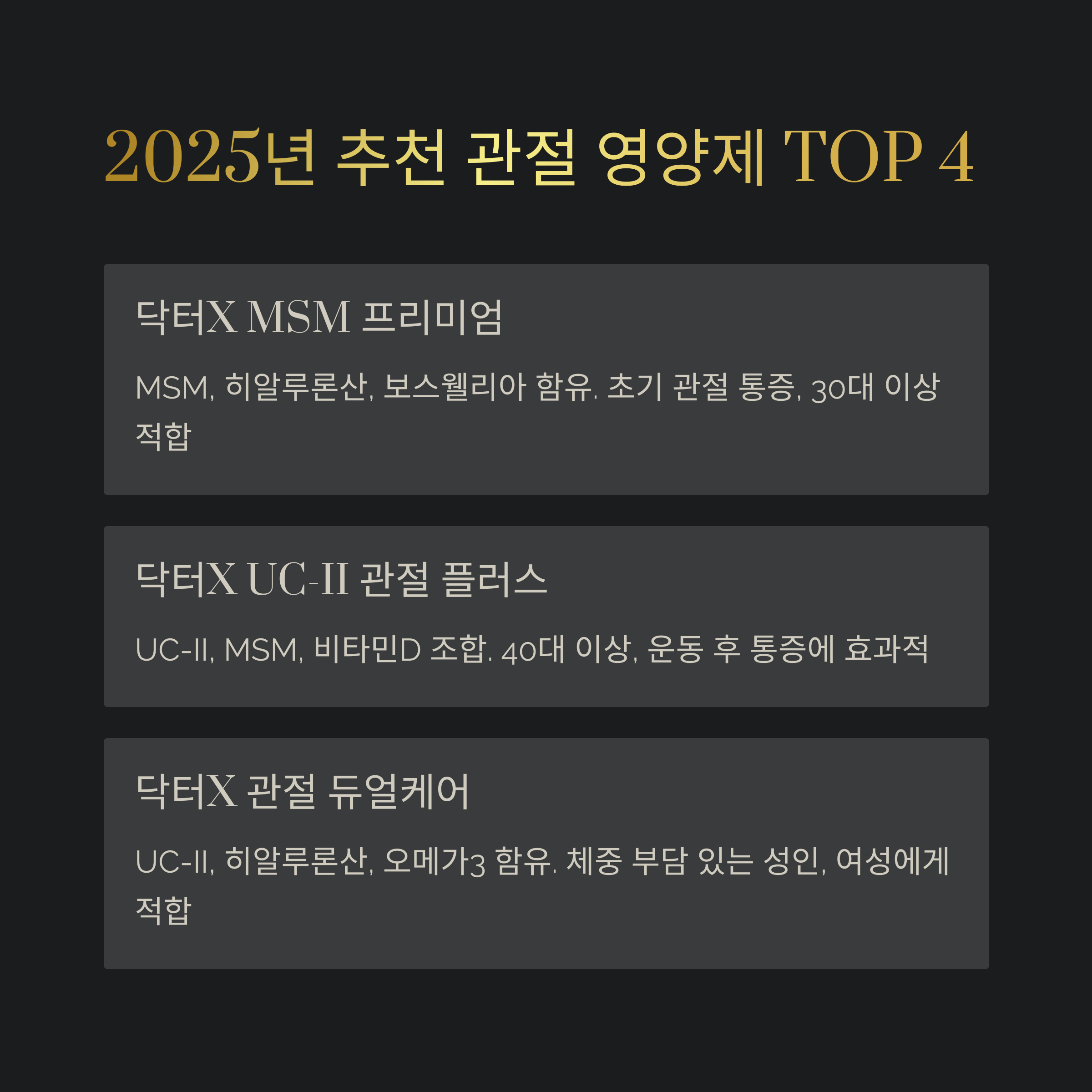 | 닥터X MSM 프리미엄 | MSM, 히알루론산, 보스웰리아 | 염증, 통증 개선 전문 | 초기 관절 통증, 30대 이후 |
