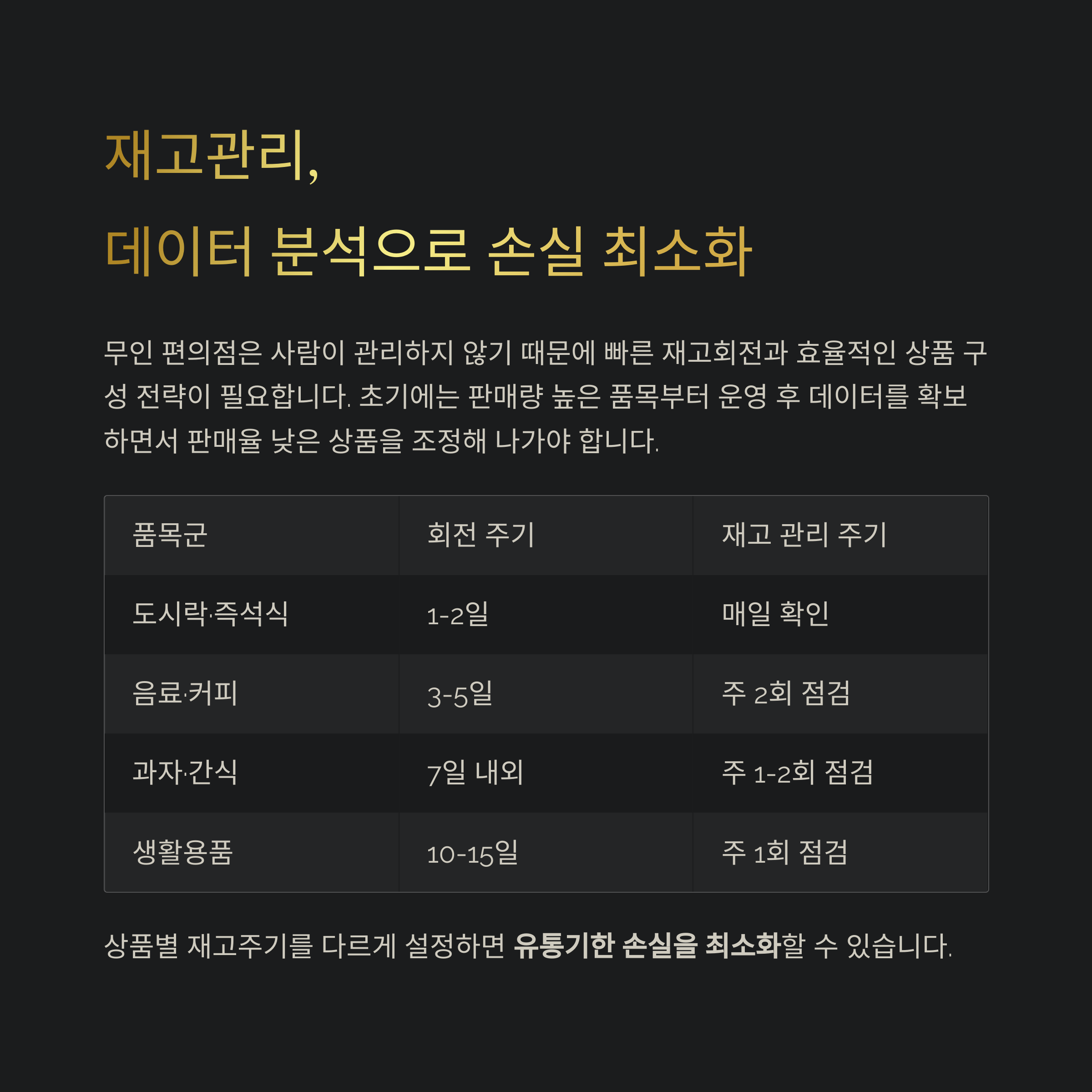 무인 편의점은 사람이 관리하지 않기 때문에 빠른 재고회전과 효율적인 상품 구성 전략이 필요합니다.
