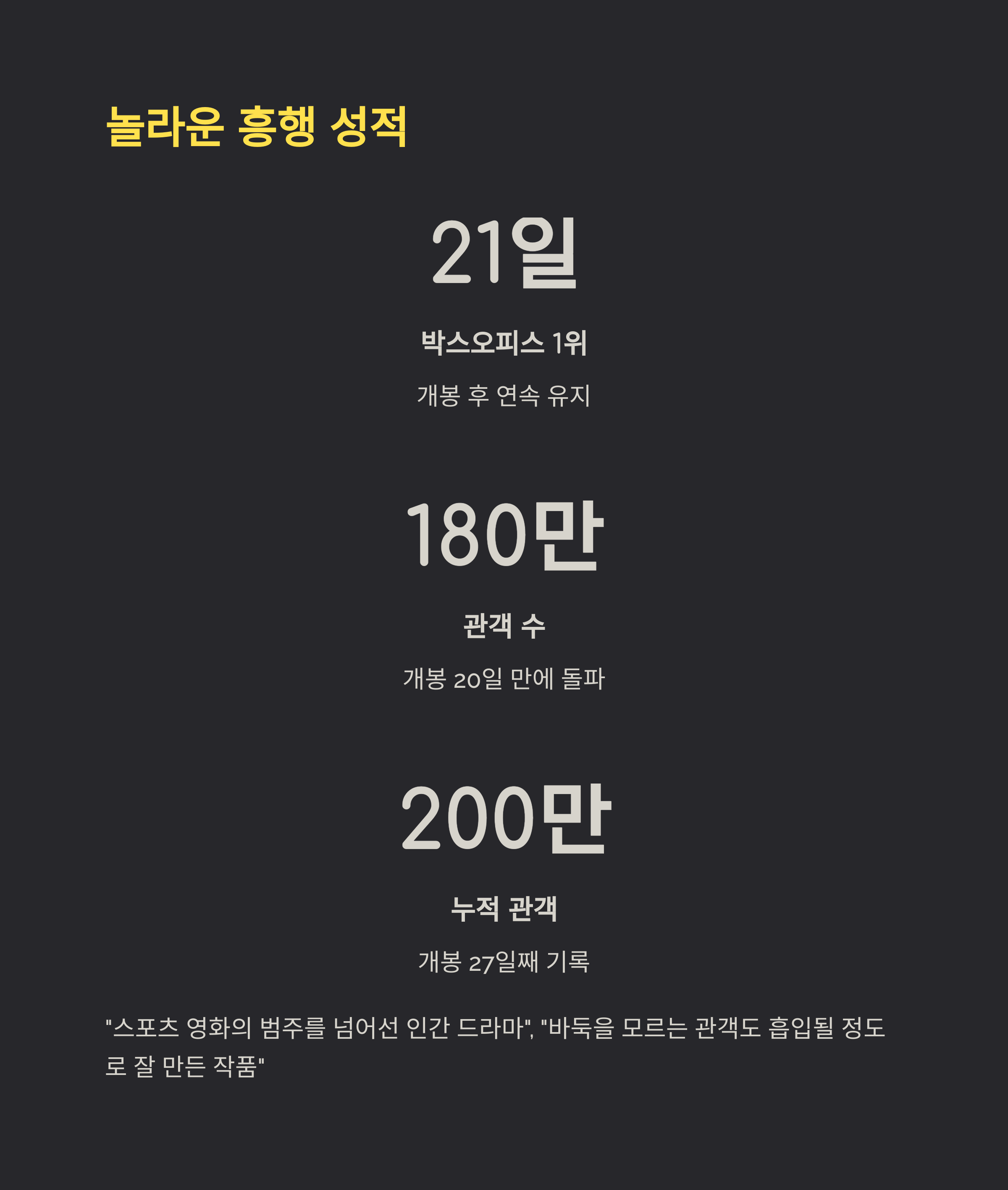 영화 '승부'는 2025년 3월 26일 개봉 직후부터 박스오피스 1위를 21일 연속 유지했습니다.