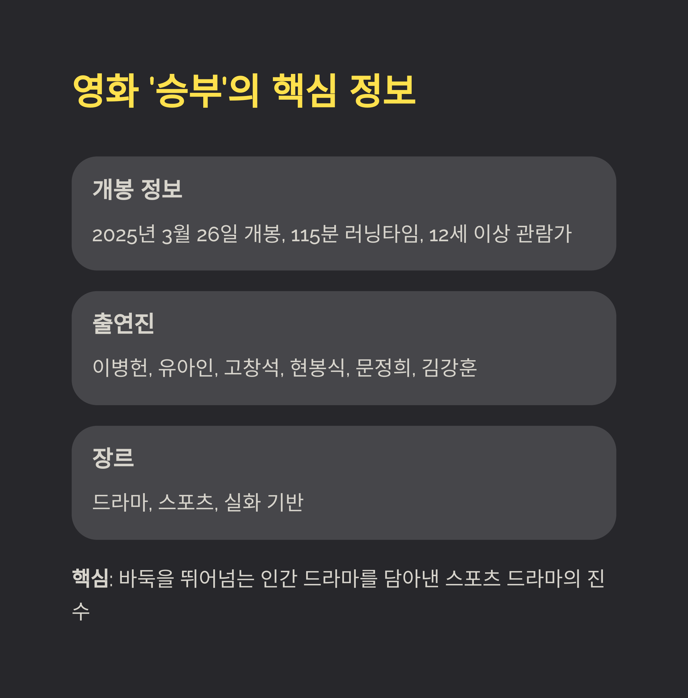 | 장르 | 드라마, 스포츠, 실화 기반 |
