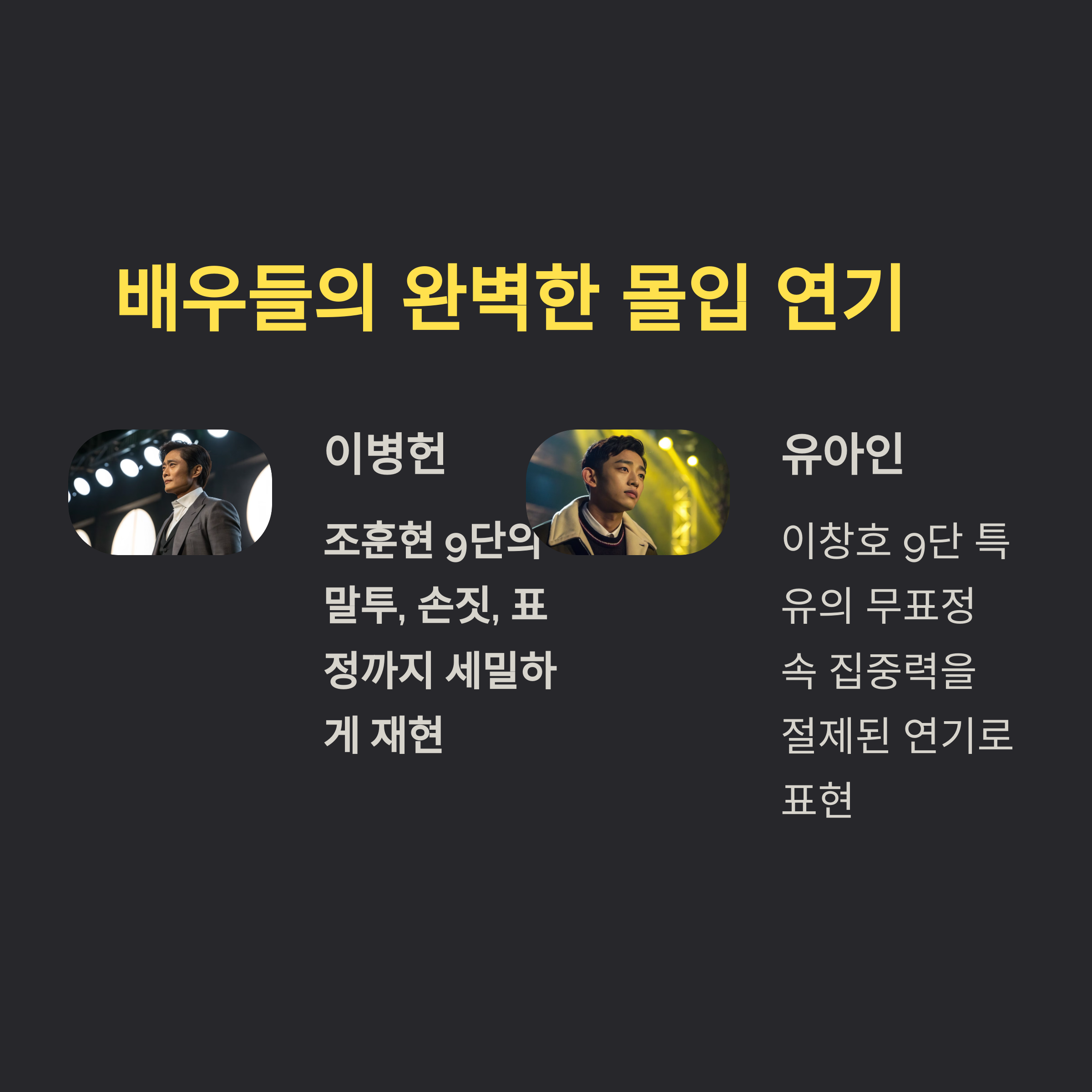 | 이병헌 | 조훈현 9단 | 절대 군주적 카리스마, 스승이자 황제 |