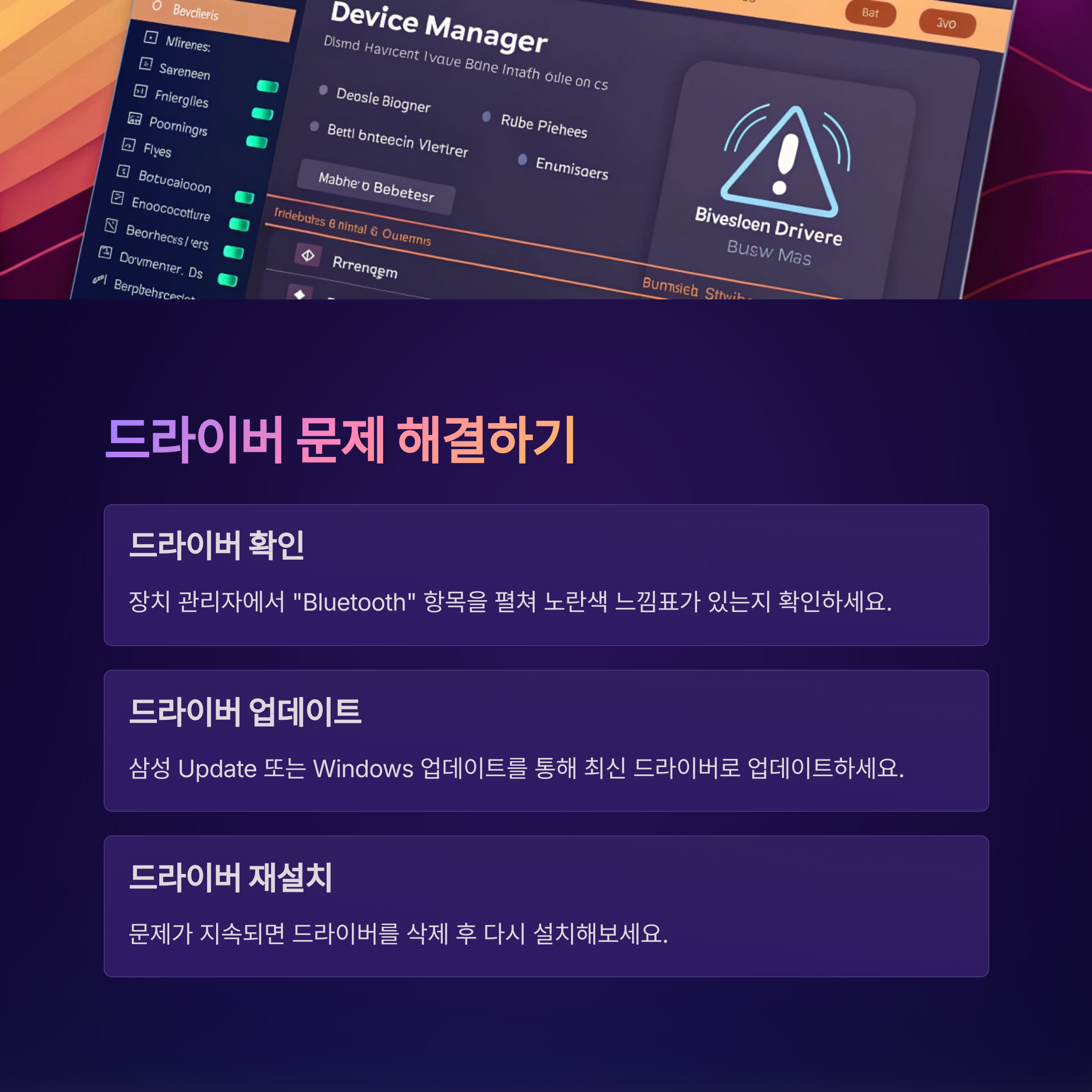 이 글에서는 드라이버 확인부터 블루투스 설정, 장치 초기화 방법까지