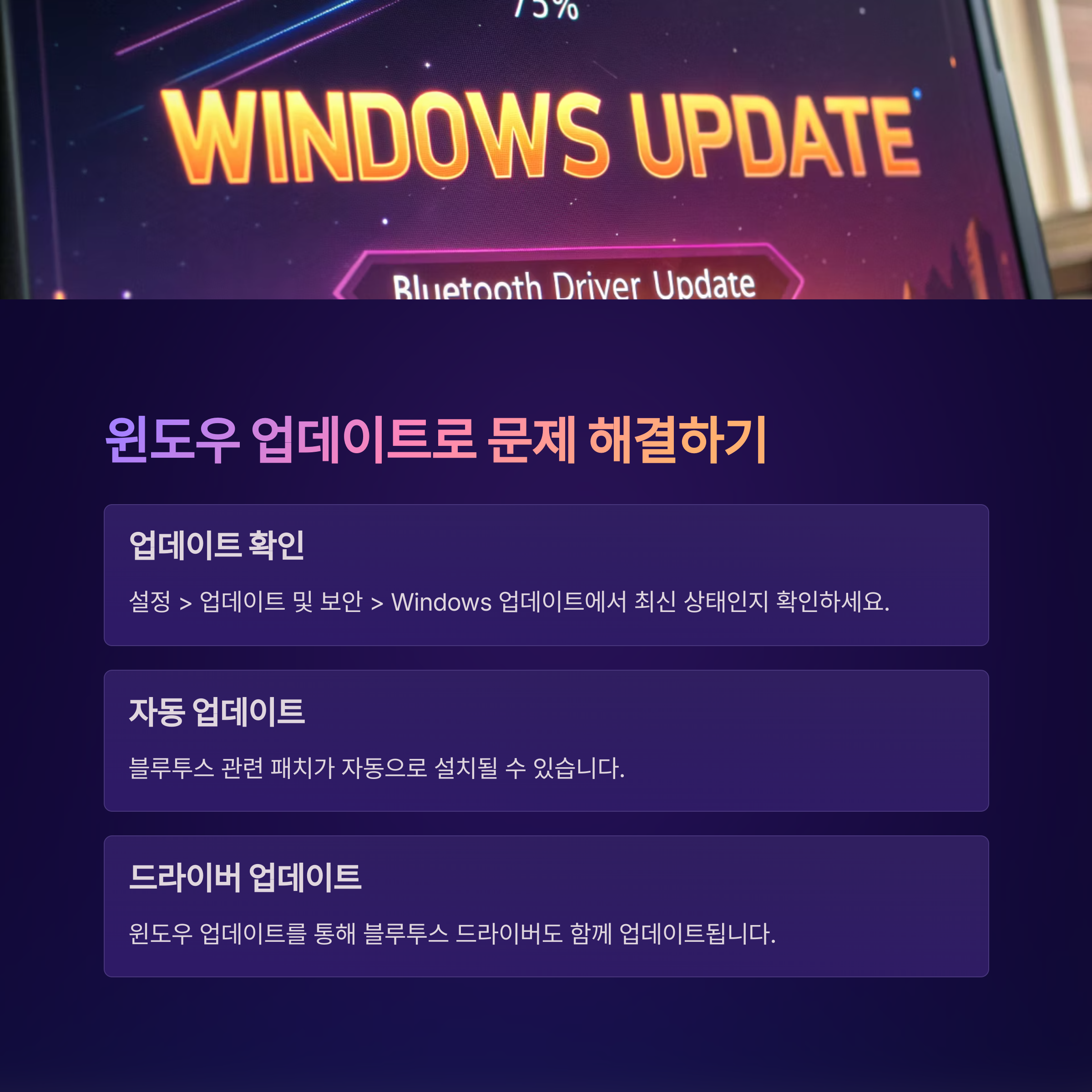 중요: 오래된 드라이버는 블루투스 충돌을 유발할 수 있으므로 항상 최신으로 유지하세요.