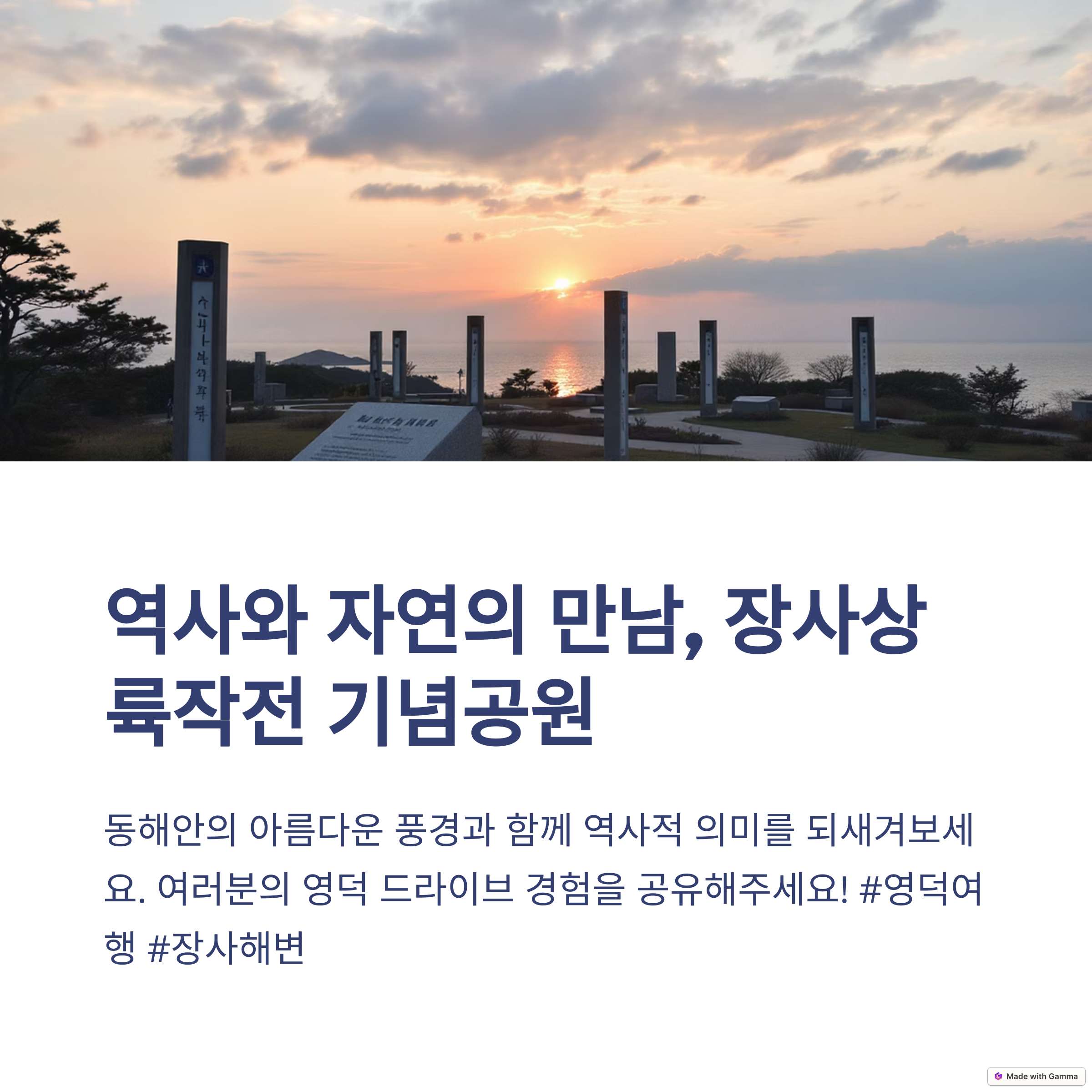 영덕 장사해변 드라이브 코스는 바다와 꽃의 조화로 여행객들에게 매력적인 경험을 제공합니다. 강구파출소에서 시작하여 삼사해상공원, 구계항, 장사해수욕장 등 다양한 자연과 문화를 느낄 수 있는 코스는 드라이브의 재미를 더해 줍니다. 또한, 장사상륙작전 전승기념관을 통해 역사의 의미를 되새기며, 캠핑과 여가 활동을 즐길 수 있는 여유로운 공간이기도 합니다.