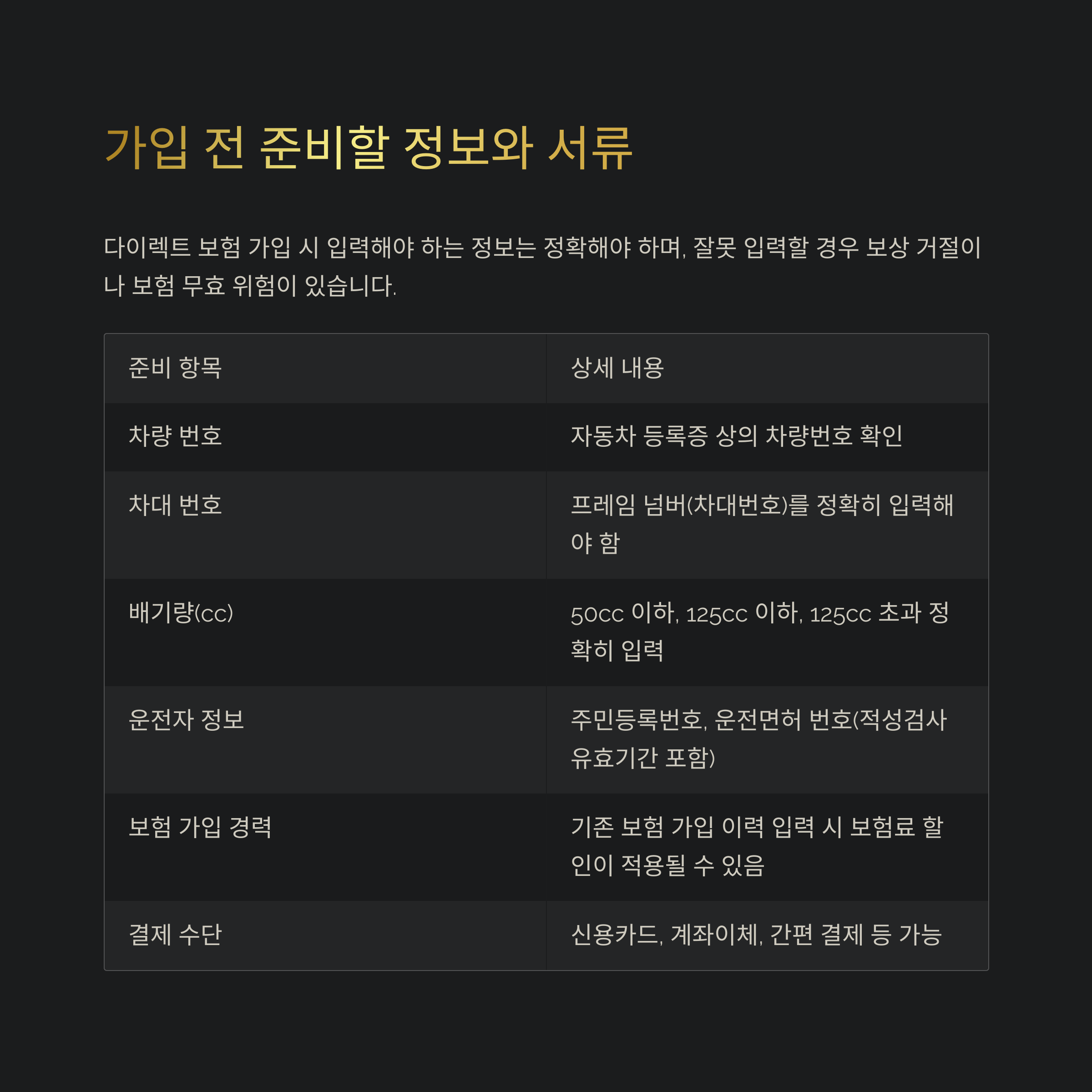 잘못 입력할 경우 보상 거절이나 보험 무효 위험이 있습니다.