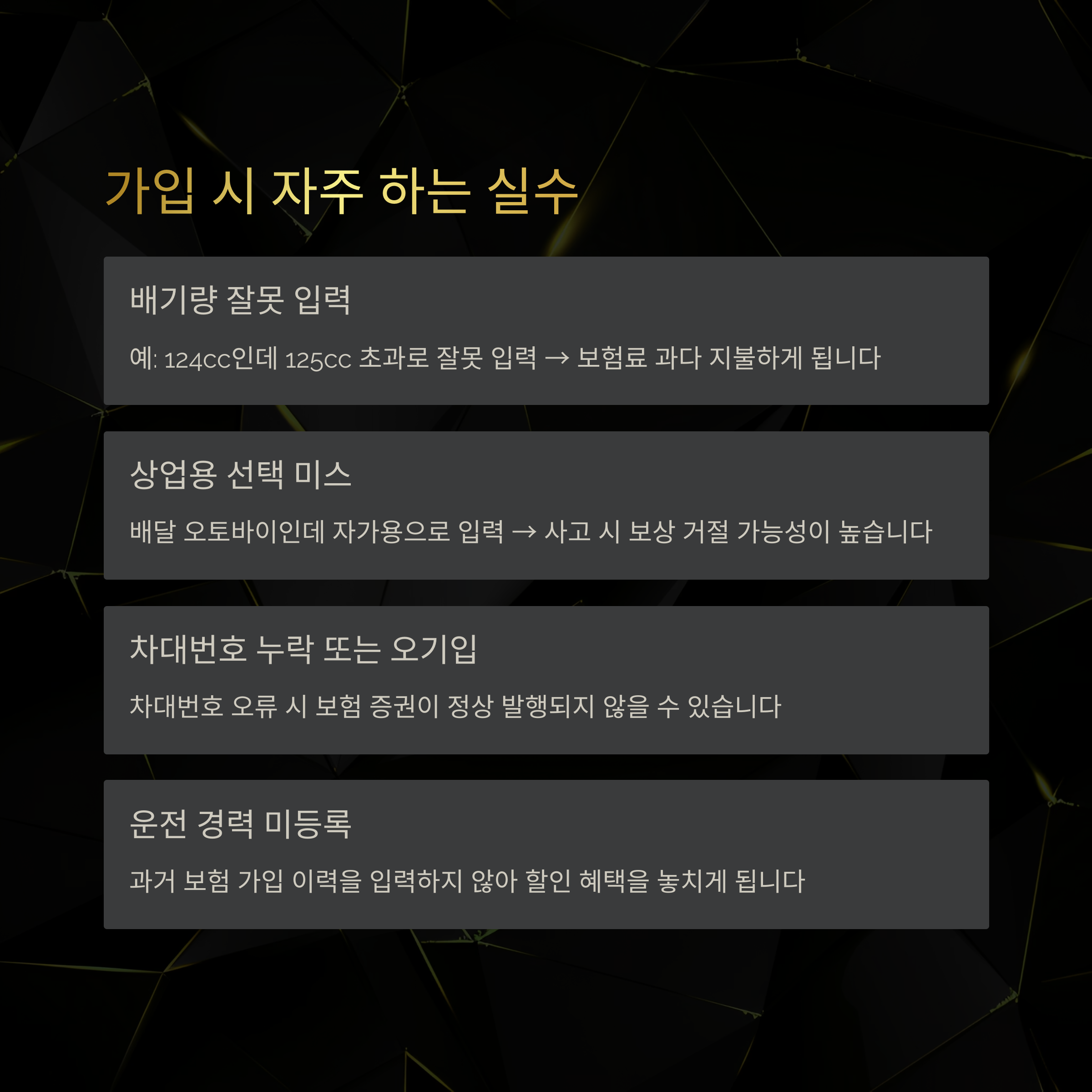 배달 오토바이인데 자가용으로 입력 → 사고 시 보상 거절 가능 - 차대번호 누락 또는 오기입