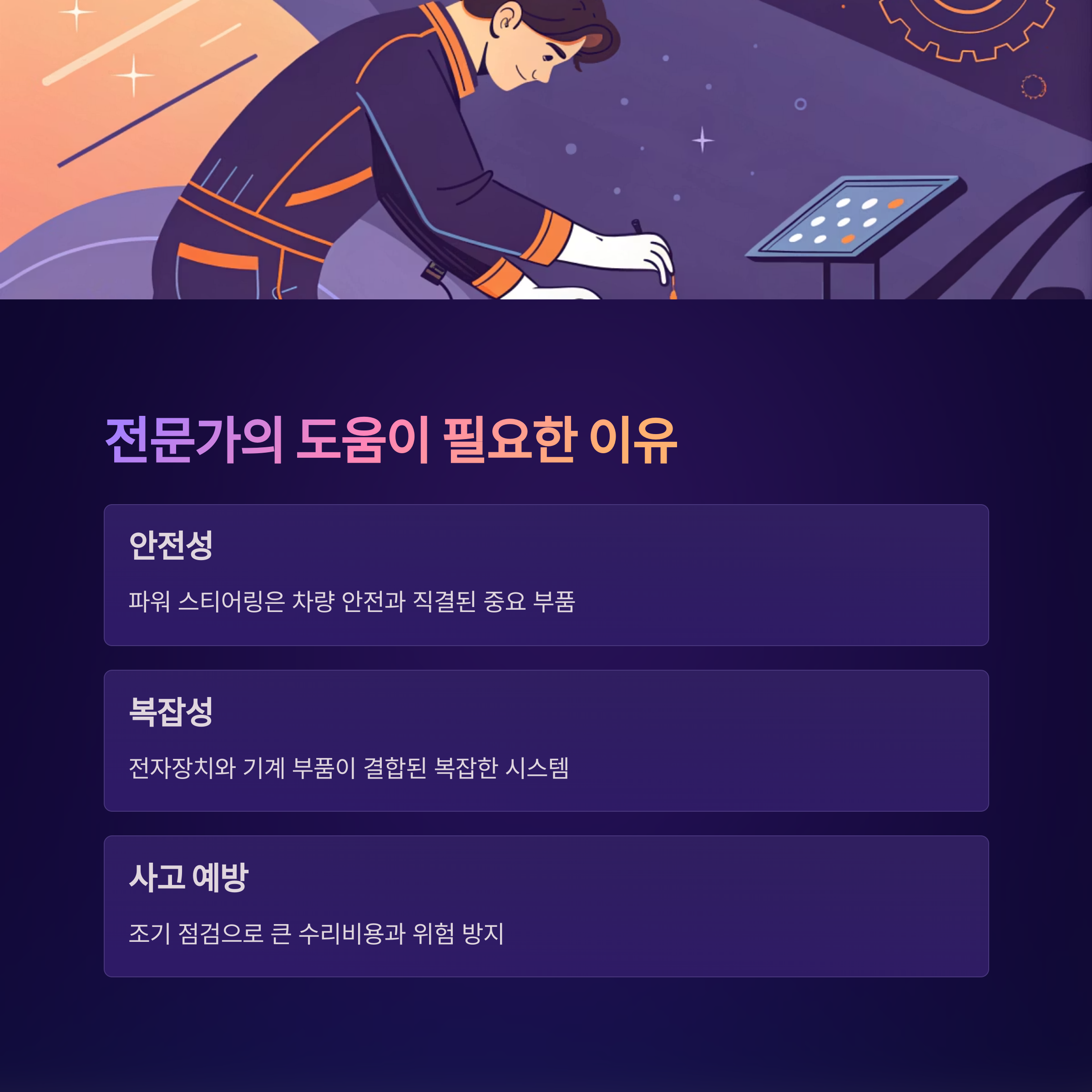 A: 잠시 켜지는 경우가 있긴 하지만, 경고등이 지속적으로 켜진다면 반드시 점검을 받는 것이 좋습니다. - Q: 파워 스티어링 수리가 어렵나요?