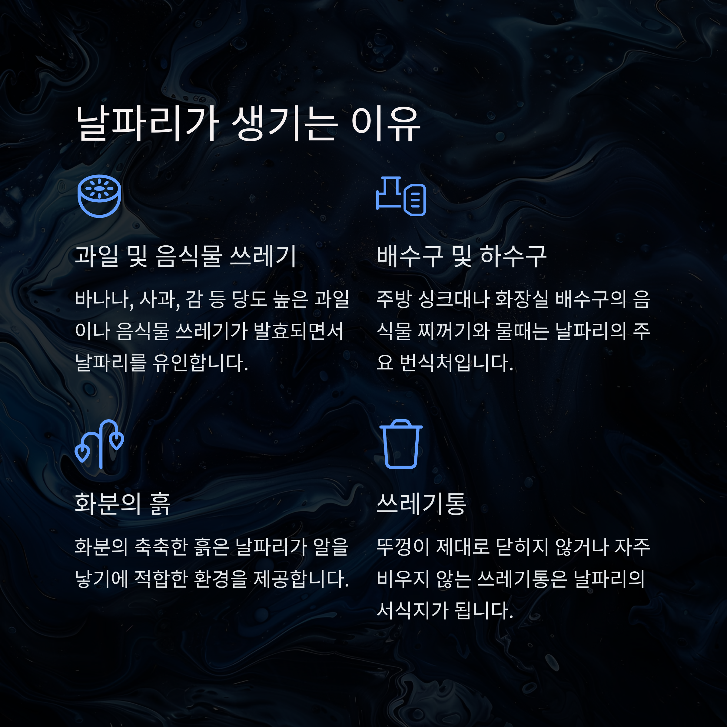 여름철이 다가오면 집안 곳곳에서 날파리로 인한 불쾌함을 경험하는 분들이 많습니다. 특히 주방, 화장실, 화분 주변 등에서 자주 발견되는 날파리는 위생 문제뿐만 아니라 스트레스의 원인이 되기도 합니다. 2025년 현재, 날파리를 효과적으로 퇴치하고 예방하는 방법들을 최신 정보를 바탕으로 정리해보았습니다.