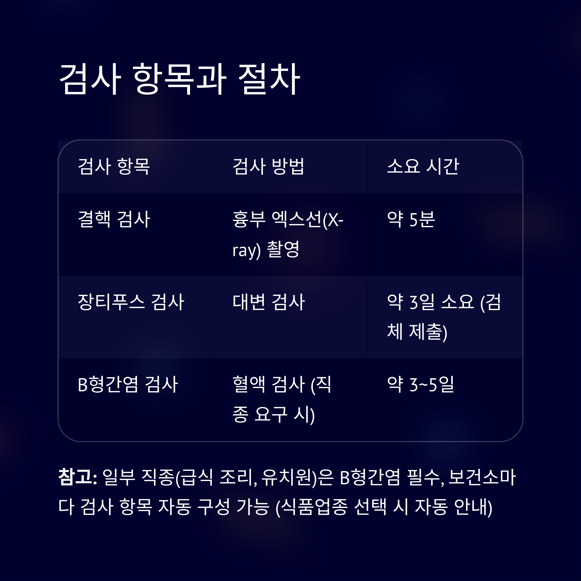 | 검사 항목 | 결핵(X-ray), 장티푸스(대변검사), B형간염 (직종별 추가 가능) |