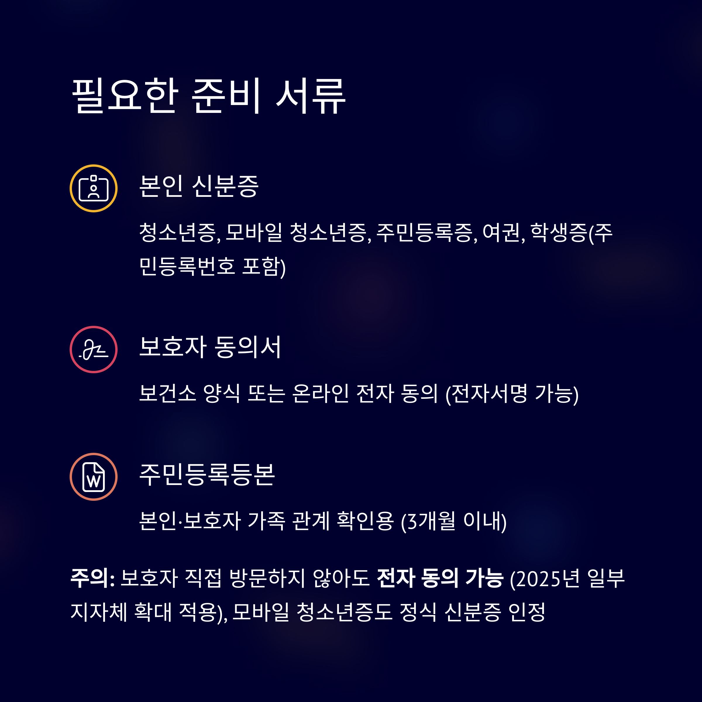 | 본인 신분증 | 청소년증, 모바일 청소년증, 주민등록증, 여권, 학생증(주민등록번호 포함) |