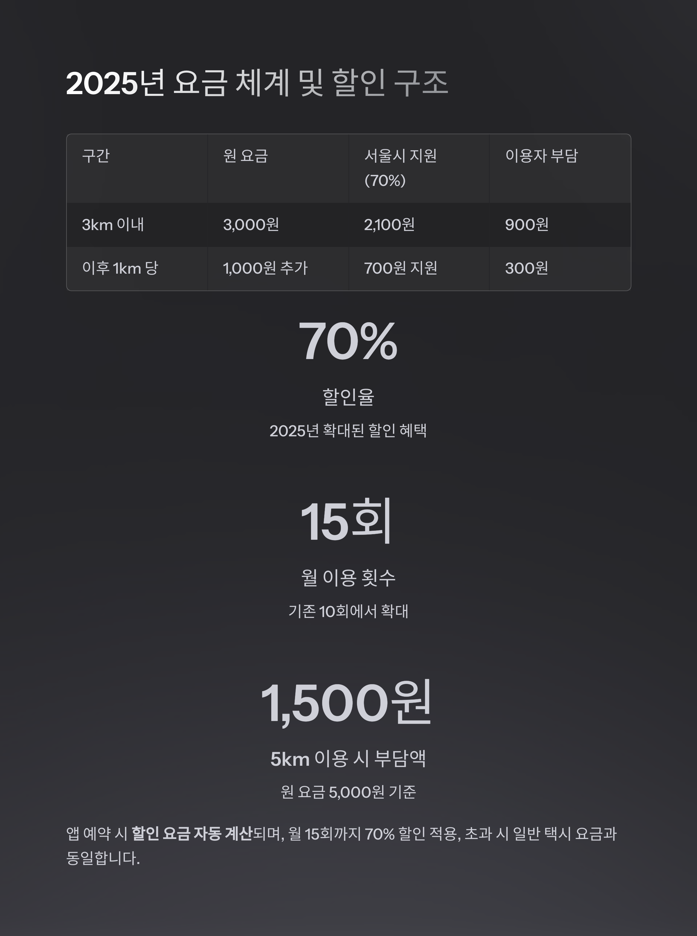 - 월 15회까지 70% 할인 적용, 초과 시 일반 택시 요금 동일