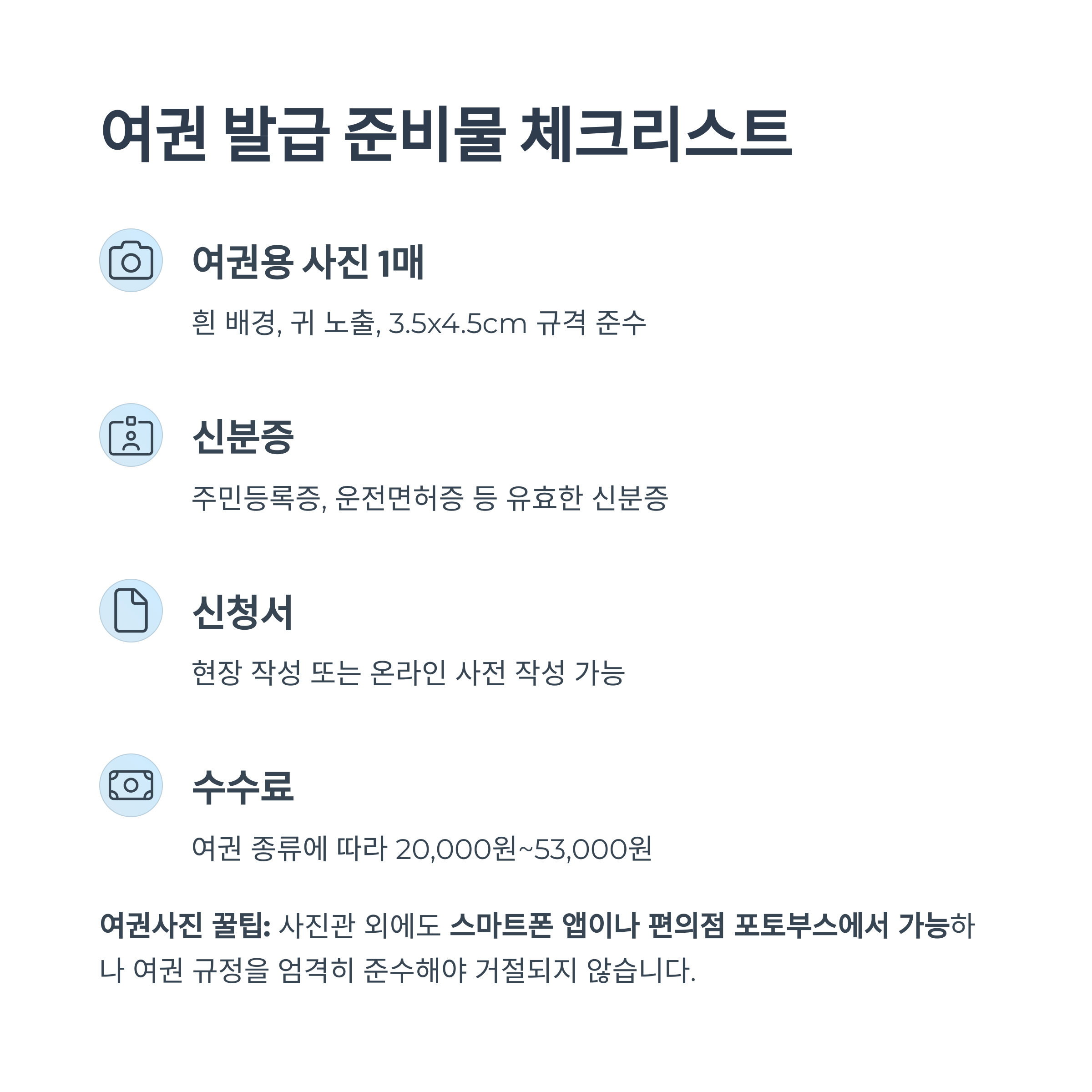 - 여권 사진, 신분증, 수수료 준비