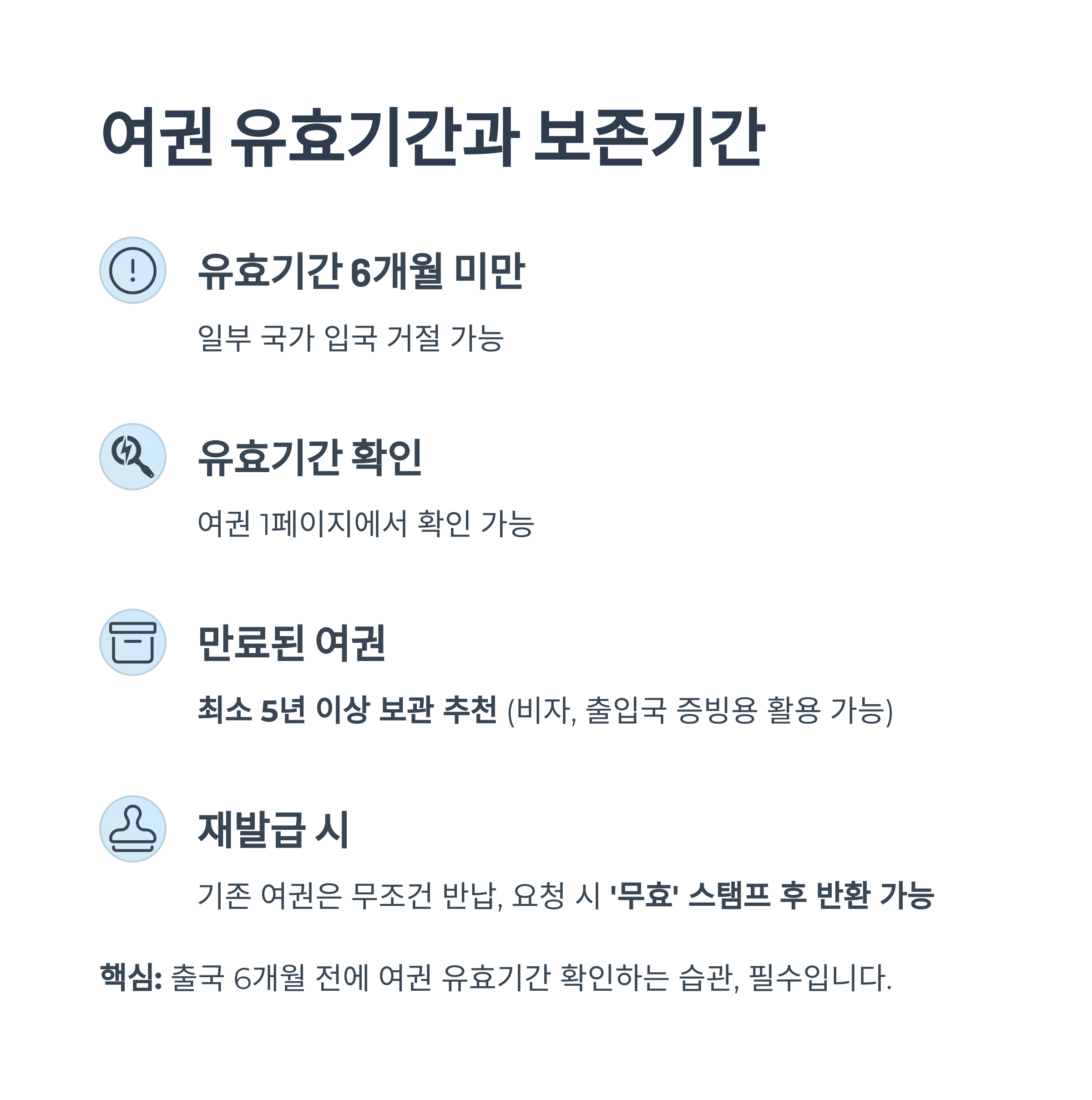 - 만료된 여권은 최소 5년 이상 보관 추천 (비자, 출입국 증빙용 활용 가능)