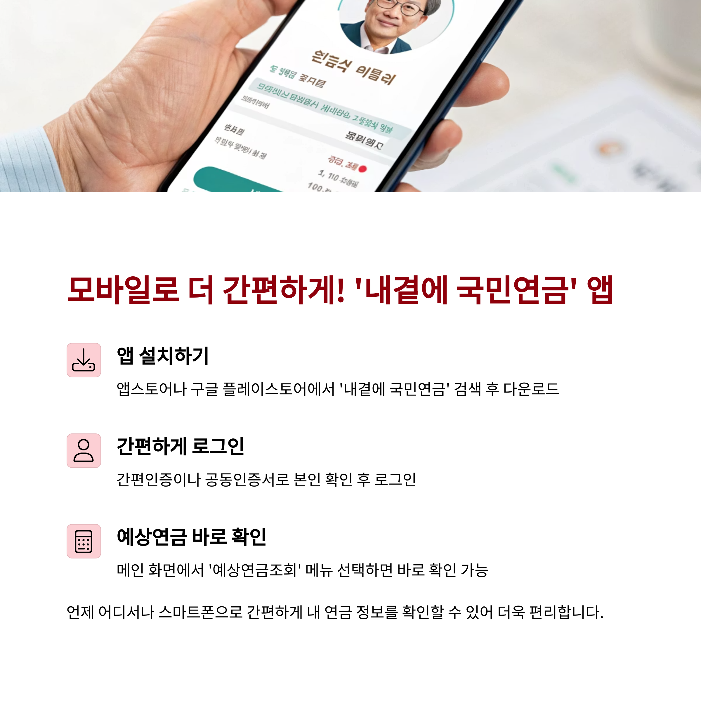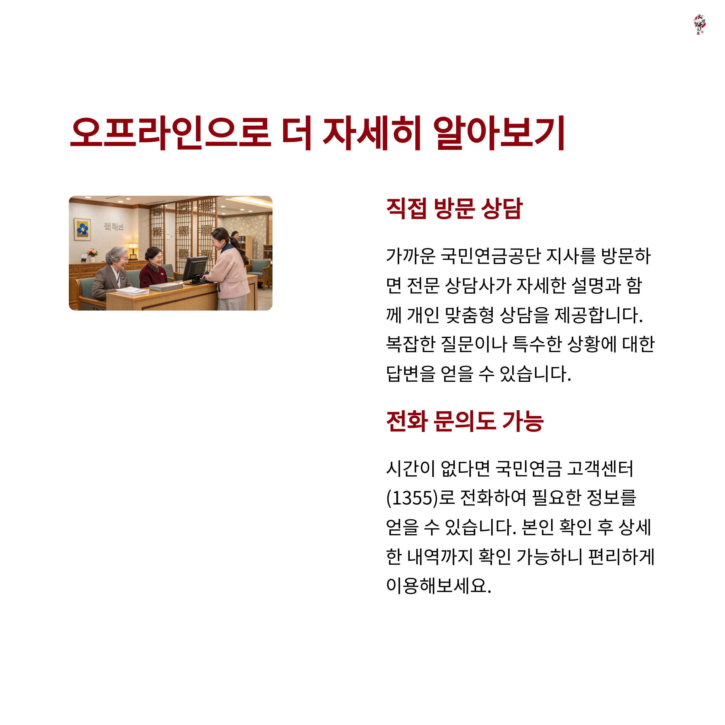 | 홈페이지 및 앱에서 쉽게 사용 가능 | 가입 기간과 소득 입력 시 자동 계산 | 1355 전화 상담 또는 지사 방문 가능 |