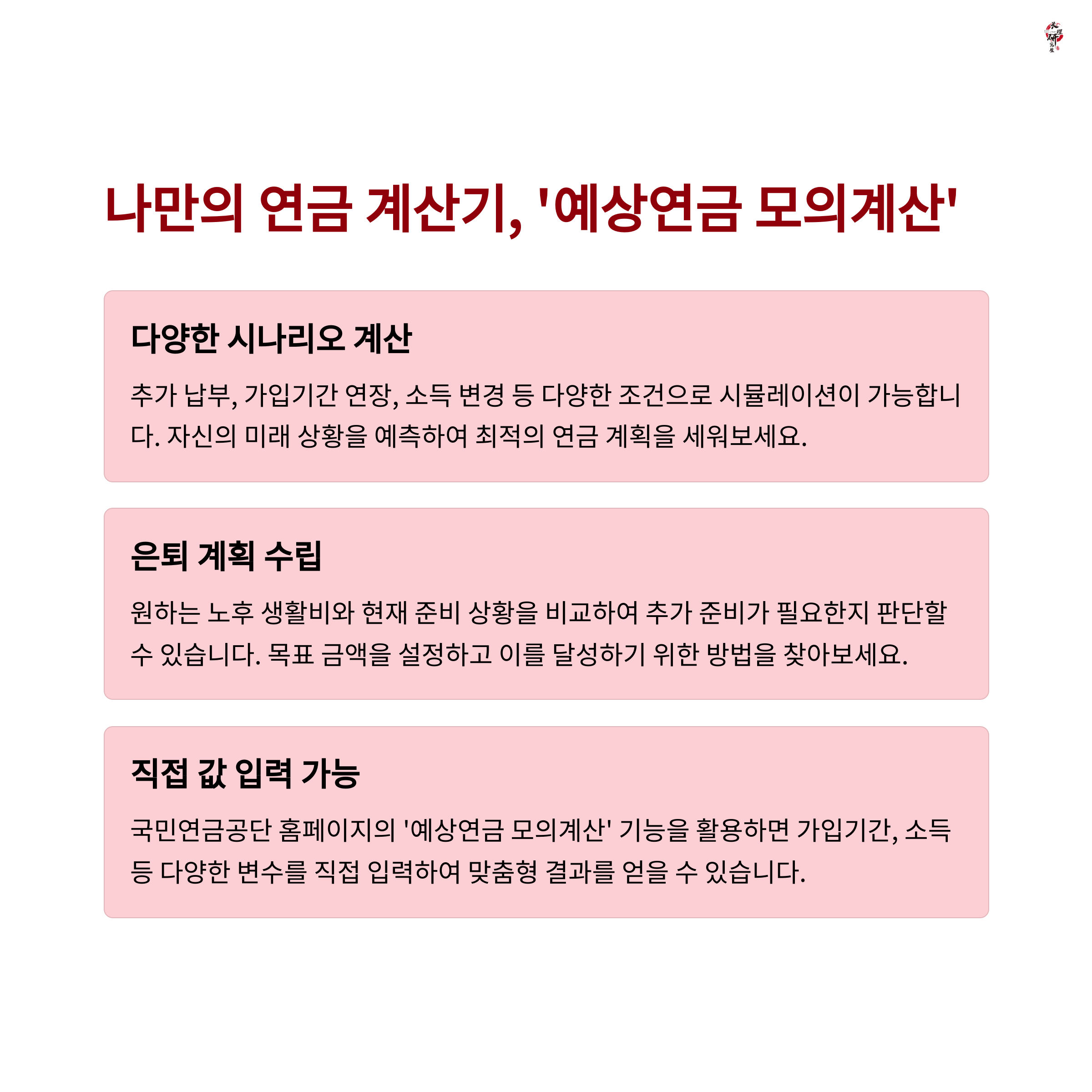 | 국민연금 계산기 위치 | 홈페이지 또는 '내곁에 국민연금' 앱에서 사용 가능 |