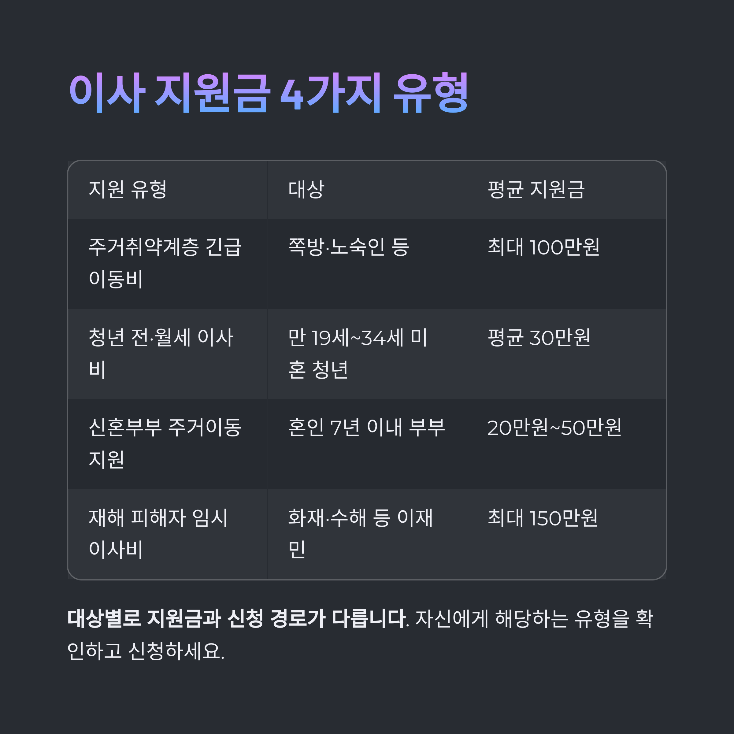 이사 지원금은 크게 네 가지 유형으로 나뉘며, 대상별로 지원금과 신청 경로가 다릅니다.