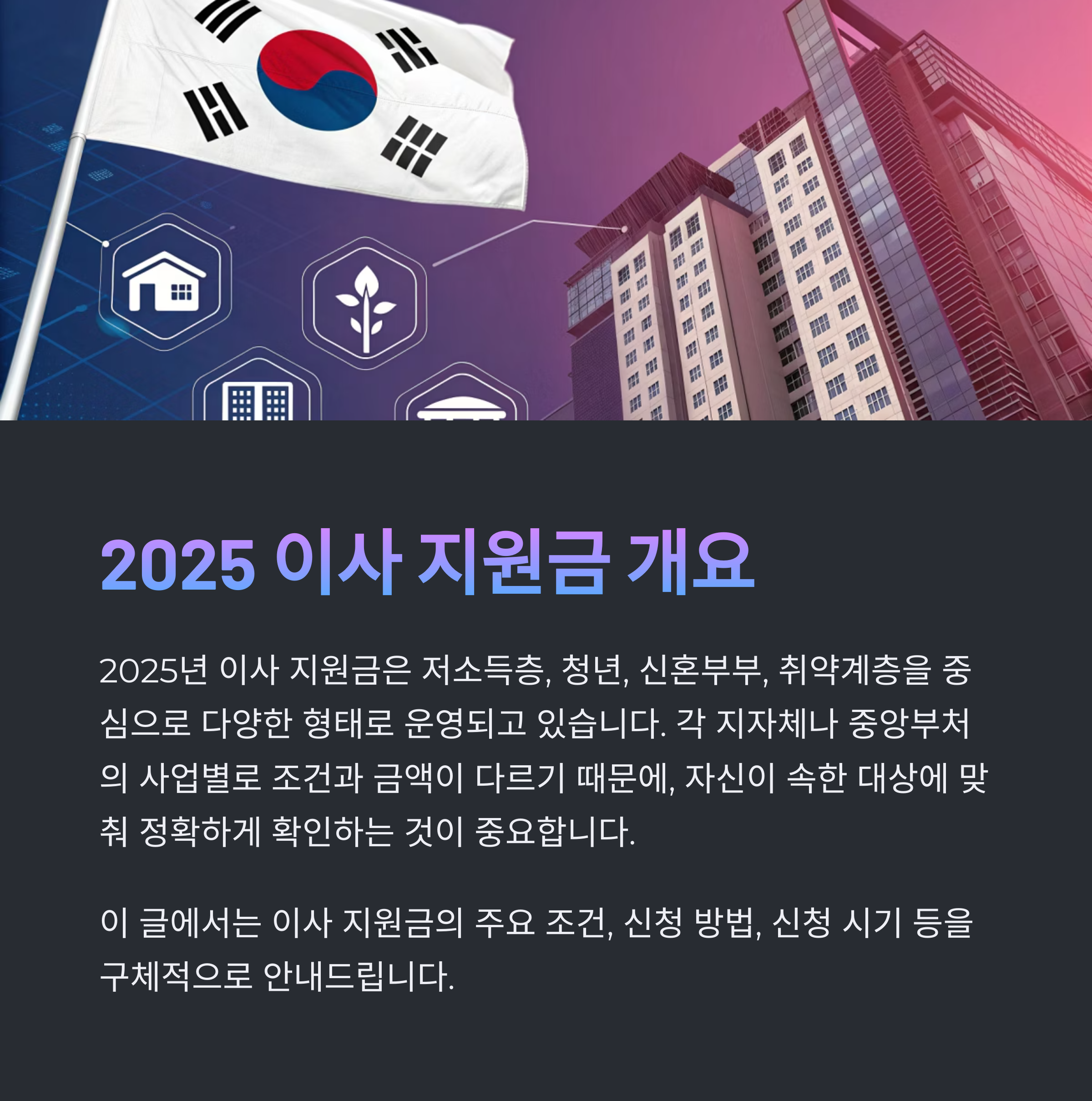 2025년 이사 지원금은 저소득층, 청년, 신혼부부, 취약계층을 중심으로 다양한 형태로 운영되고 있습니다.