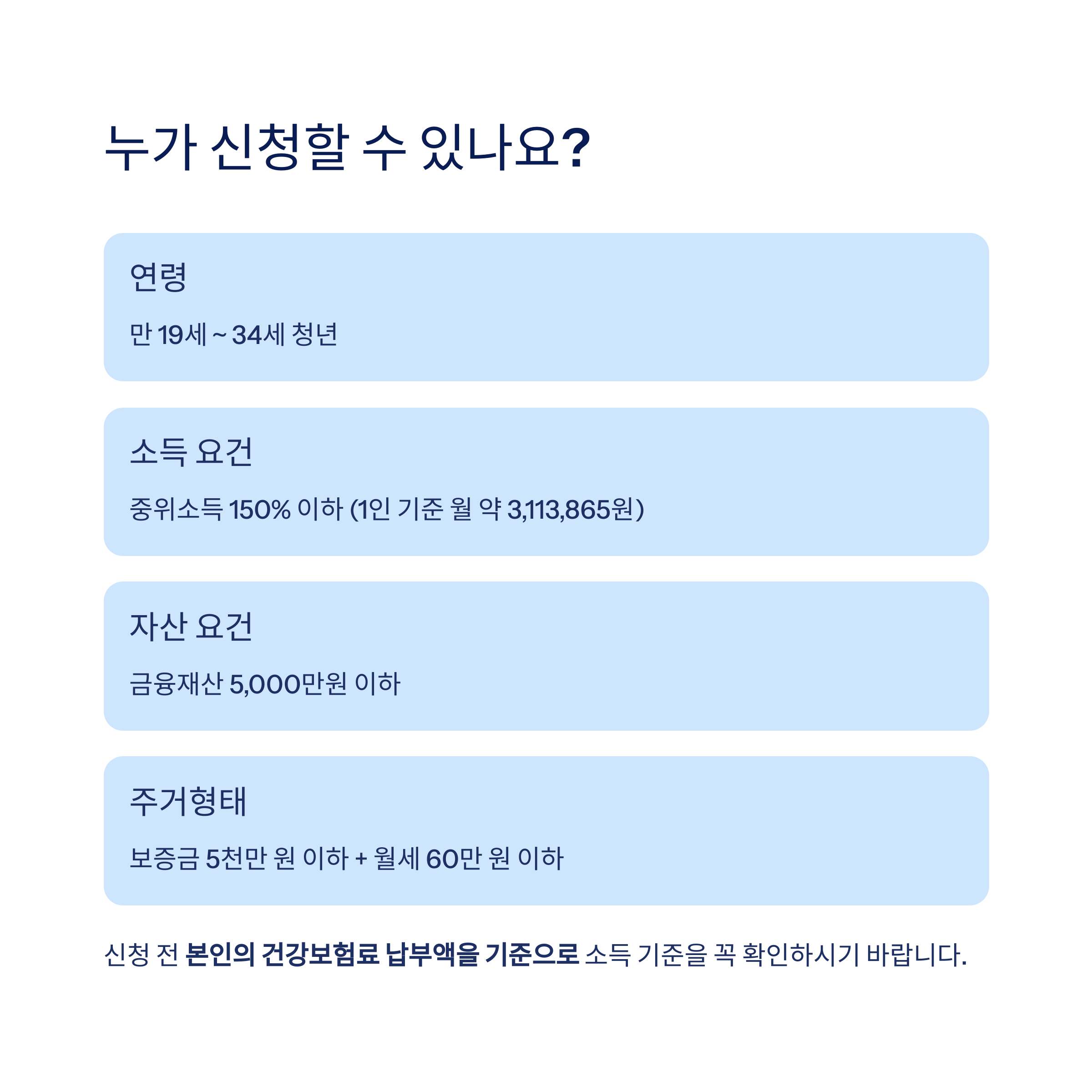 | 소득 요건 | 중위소득 150% 이하 (1인 기준 월 약 3,113,865원) |