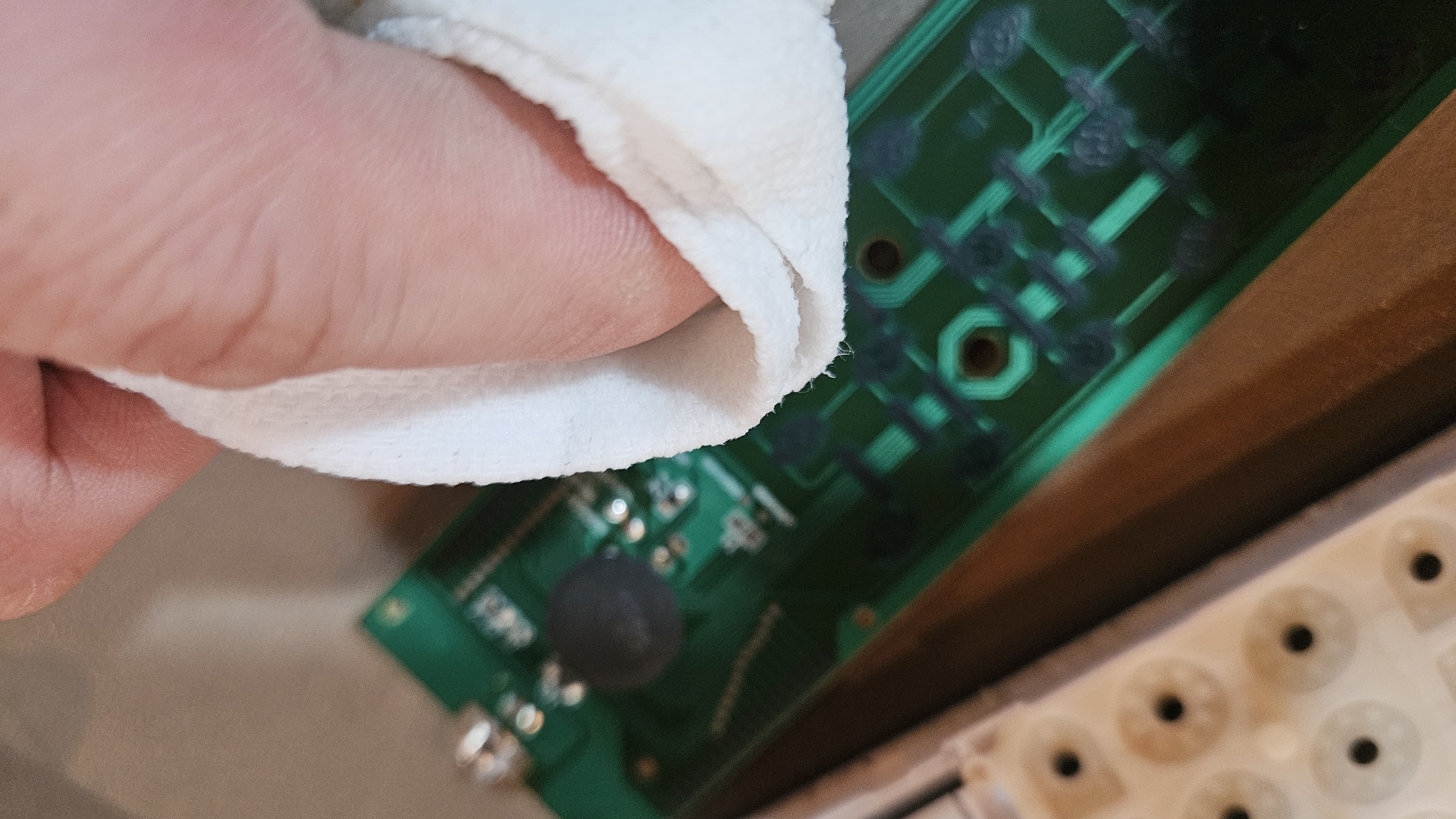 기판과 버튼이 눌리는 곳을 물수건으로 깨끗이 닦아 냈습니다. 고무 부분이 묻어있는 것을 닦아냈습니다.